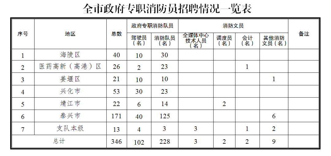 為更好護(hù)航泰州市社會(huì)經(jīng)濟(jì)發(fā)展,不斷提升綜合消防救援能力,根據(jù)各地消防救援隊(duì)伍建設(shè)實(shí)際,泰州市消防救援支隊(duì)面向社會(huì)公開招聘346名政府專職消防員(附表1)。現(xiàn)將有關(guān)事項(xiàng)公告如下: