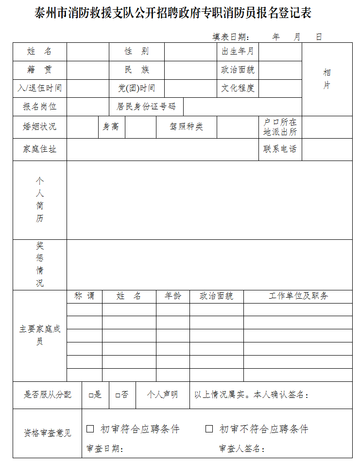 采取網(wǎng)上和實(shí)地報(bào)名方式。應(yīng)聘者須填寫《泰州市消防支隊(duì)公開招聘政府專職消防員報(bào)名登記表》(附件2),同時(shí)將本人身份證、戶口本、學(xué)歷證書、戶口所在地派出所出具的無(wú)違法犯罪記錄證明、所報(bào)考崗位所需證書、退役軍人及國(guó)家綜合性消防救援隊(duì)伍退出消防員相關(guān)證明等材料復(fù)印件發(fā)送至對(duì)應(yīng)報(bào)名單位的郵箱(添加時(shí)需要備注姓名、報(bào)名崗位、年齡、學(xué)歷、兵齡、隊(duì)齡)。