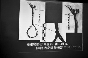 通報(bào)方:自縊工具為死者所穿鞋上的鞋帶,死者穿一雙黑色高幫旅游鞋,鞋帶呈柱狀,每根長(zhǎng)172厘米,直徑0.4厘米。